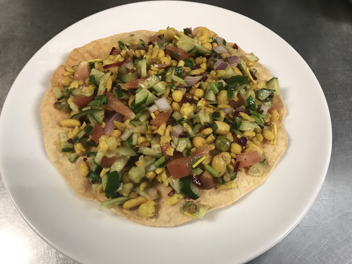 パパドにトマトやキュウリなどたくさんの具材をトッピング